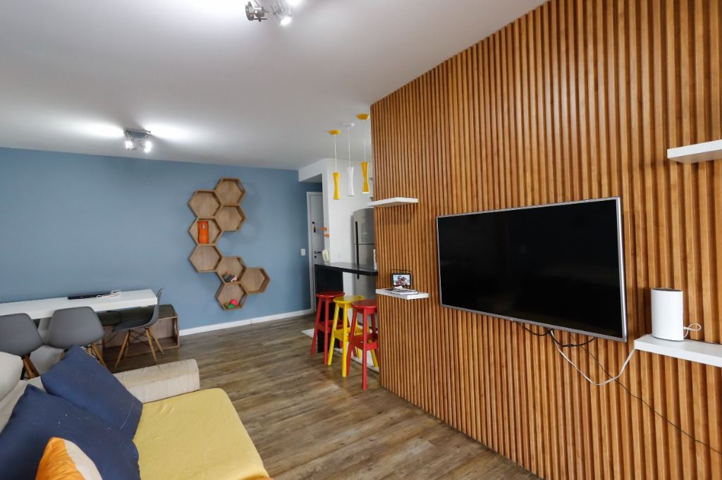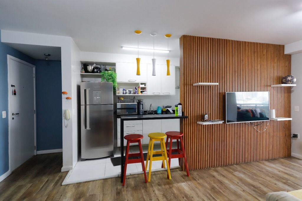 Sala integrada (estar, jantar e cozinha americana) com piso vinílico e painel ripado para home theater