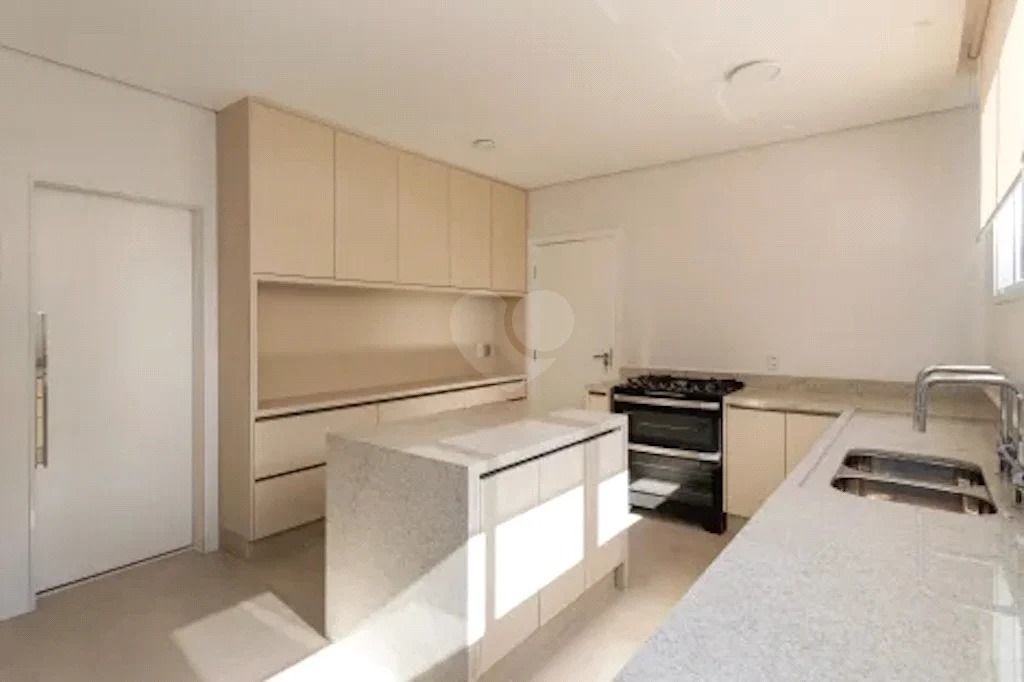 A cozinha é ampla, iluminada por grandes janelas que permitem a entrada de luz natural, com armários embutidos em tons neutros e uma ilha central em granito, proporcionando funcionalidade e estilo.
