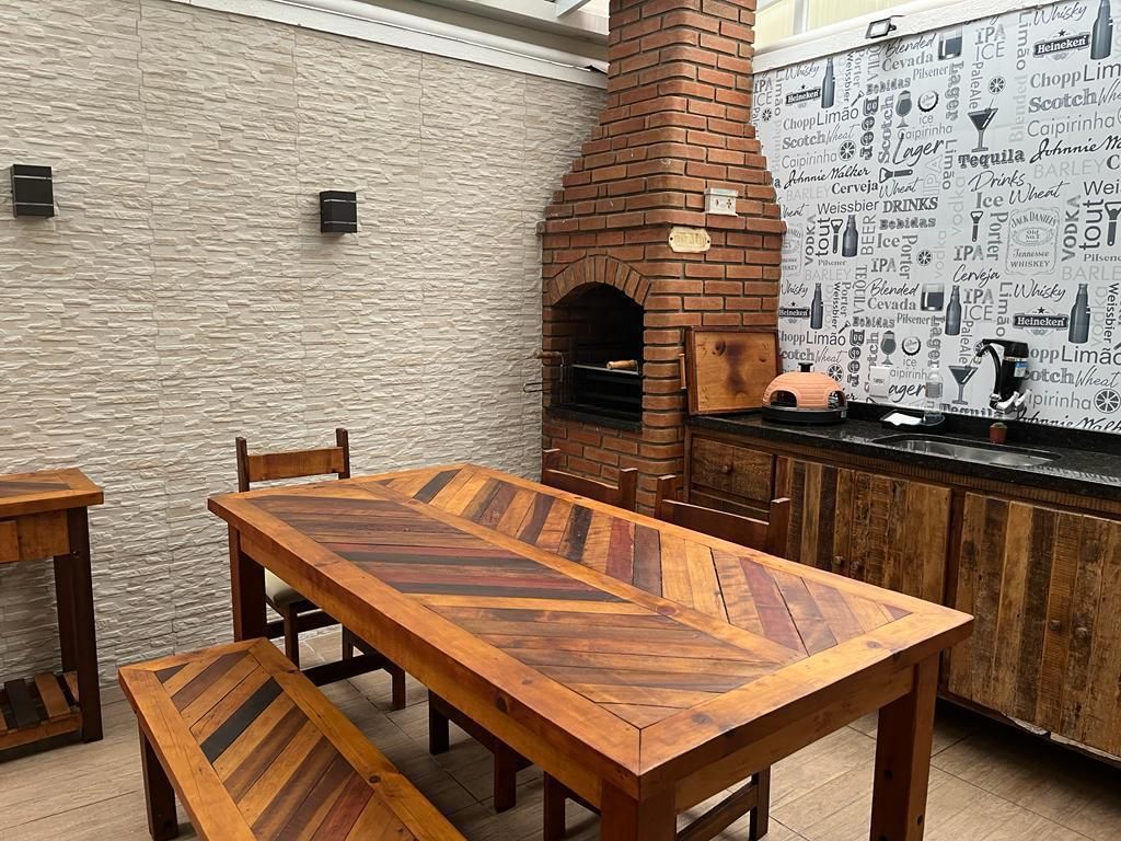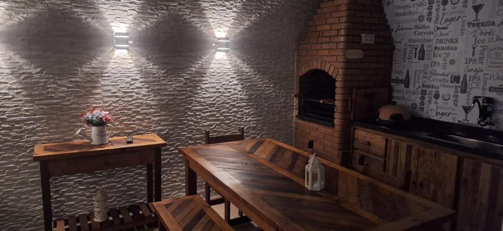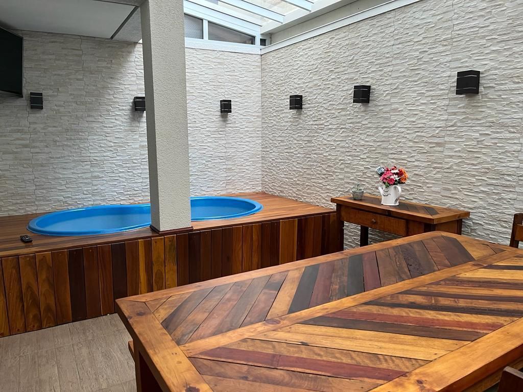 Espaço gourmet integrado à casa, com churrasqueira e piscina