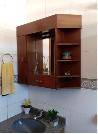 Banheiro social com box em vidro fumê e bancada em granito